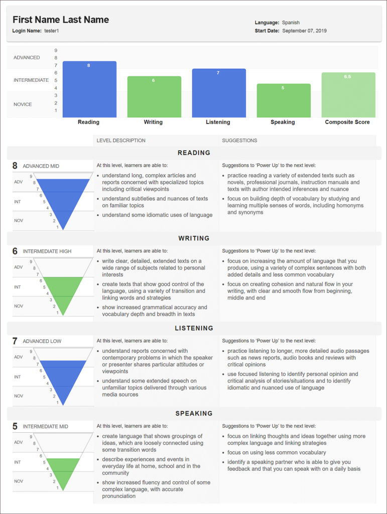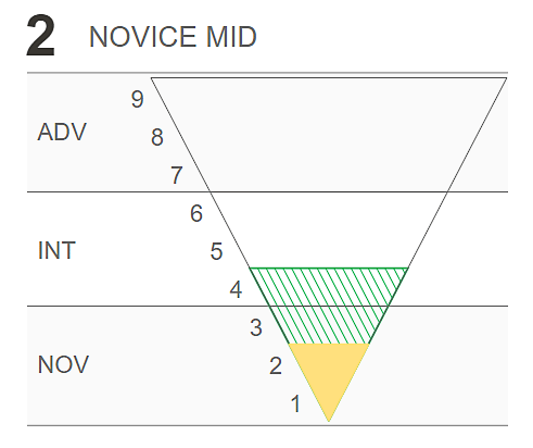 Next to the pyramid, you’ll see descriptions of the skill (Reading, Writing, Listening, Speaking) and the level category (Novice, Intermediate, Advanced).