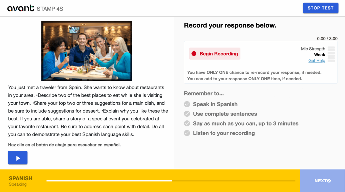 - Read the entire prompt first. Click the blue play button to listen to the prompt in the testing language. You can listen to the recording two (2) times. After two attempts, the button will become inactive.