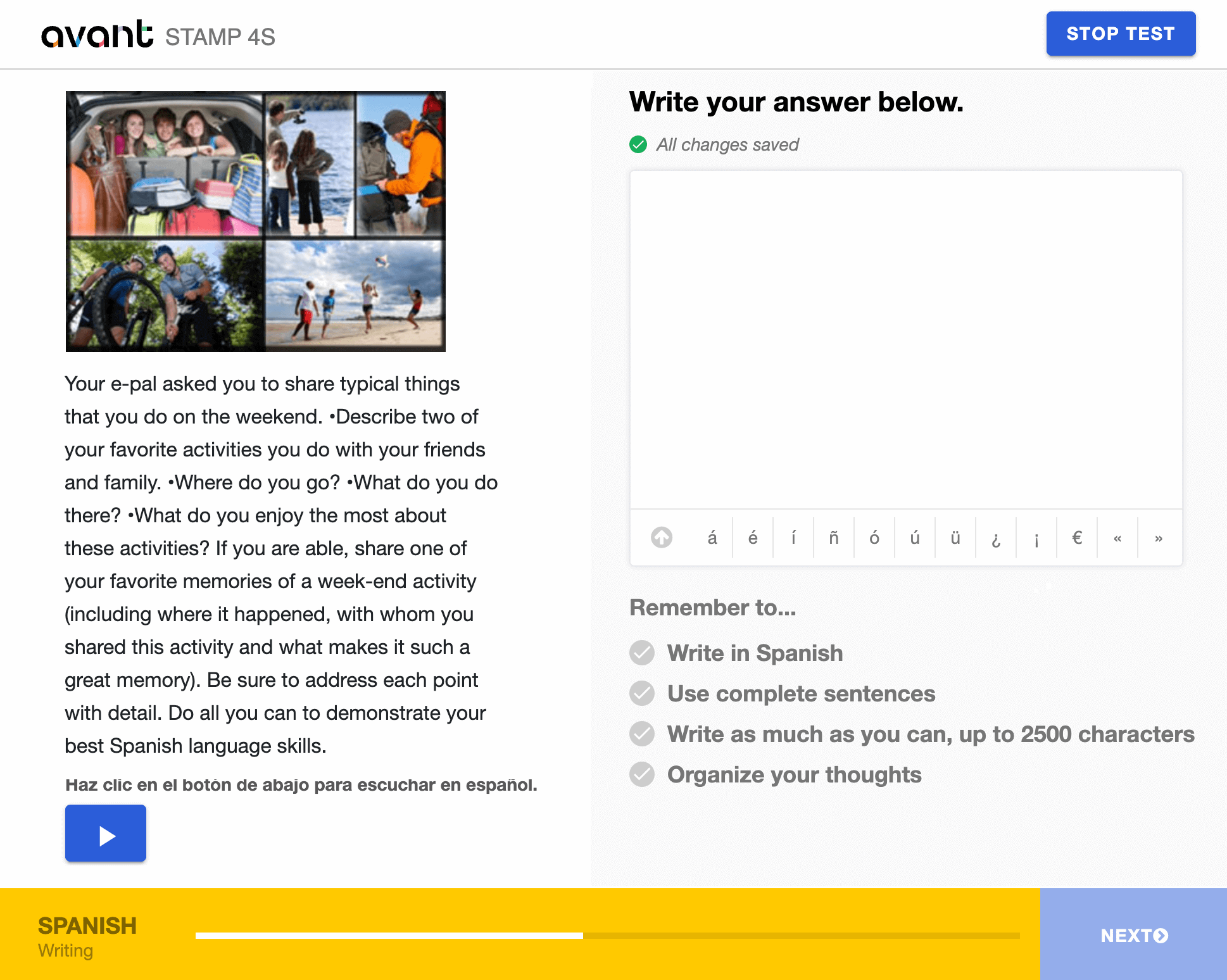 - Read the entire prompt first. Click the blue play button to listen to the prompt in the testing language. You can listen to the recording 2 times. After two attempts, the button will become inactive.